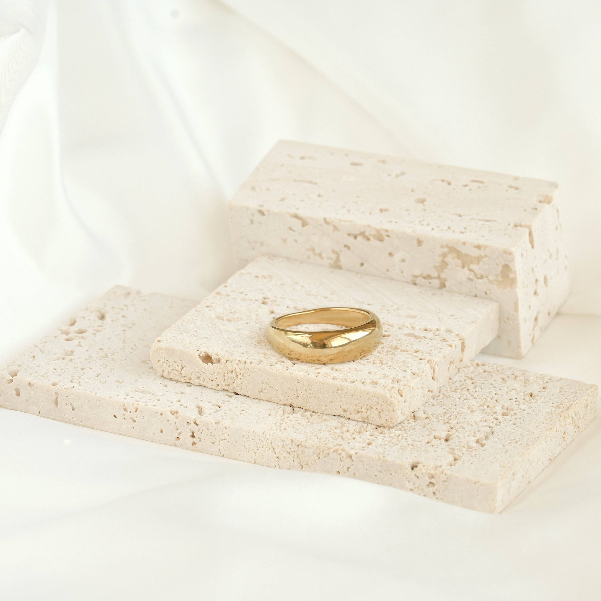 Indulge in luxury with our waterproof 18k gold PVD plated dome rings. Choose from four options: croissant, Pavé diamond, thin dome, or diamond line. Material: Stainless Steel Size : 5, 6, 7, 8, 9 Band Width: A. Croissant: 2.5x8mm B. Pave Diamond: 3x9.5mm C. Thin Dome: 2.5x6mm D. Diamond Line.